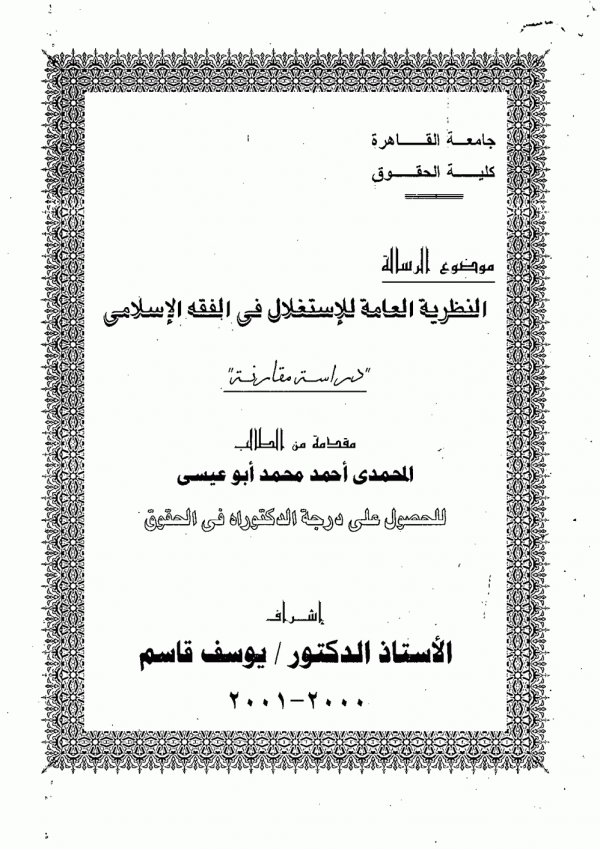 Dissertation note: أطروحة (دكتوراه)-جامعة القاهرة، كلية الحقوق، قسم الشريعة الإسلامية، 2001.