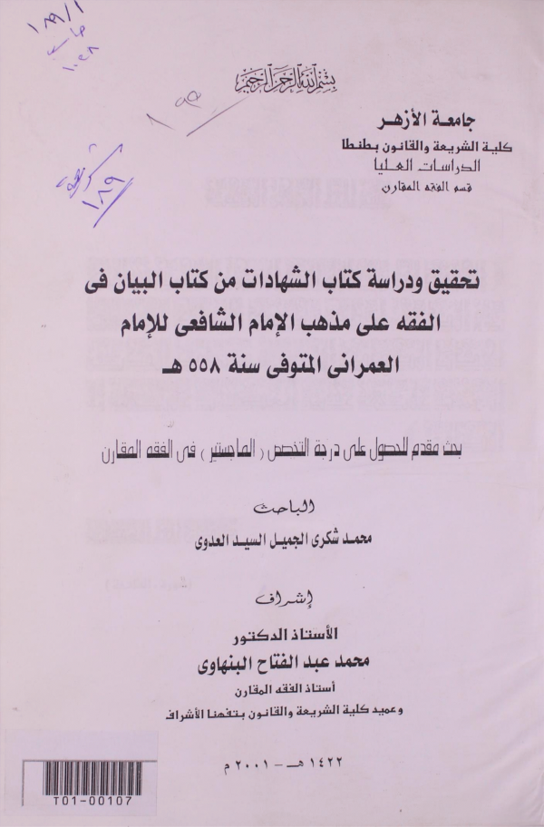 تحقيق ودراسة كتاب الشهادات من كتاب البيان فى الفقه على مذهب الامام الشافعى للامام العمراني /
