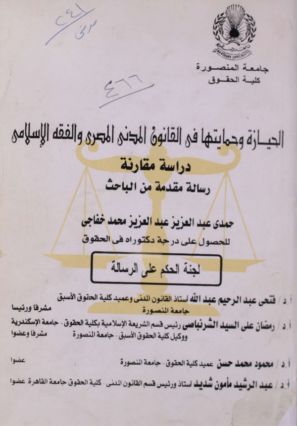 Dissertation note: أطروحة (دكتوراه) - جامعة المنصورة، كلية الحقوق، قسم القانون المدنى 2011.