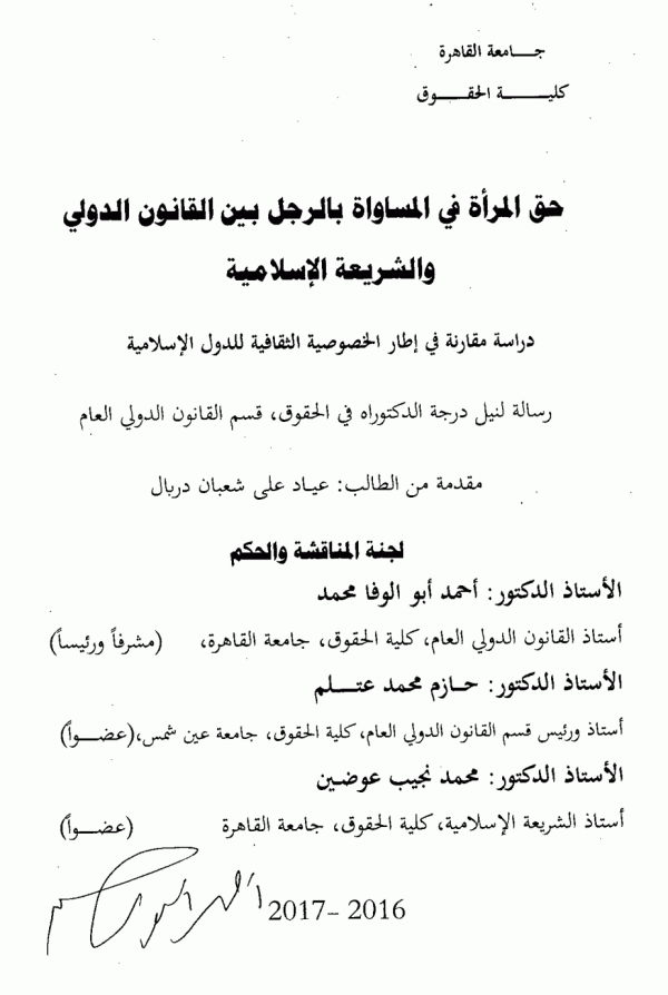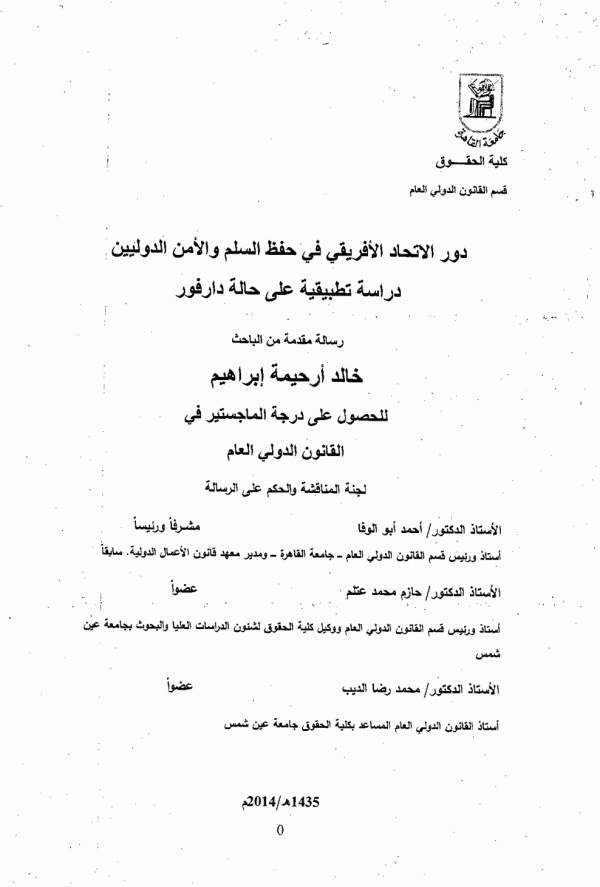 Dissertation note: اطروحة (ماجستير) - جامعة القاهرة - كلية الحقوق - قسم القانون الدولى، 2013
