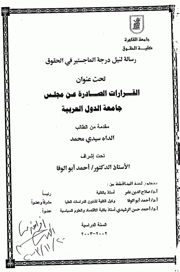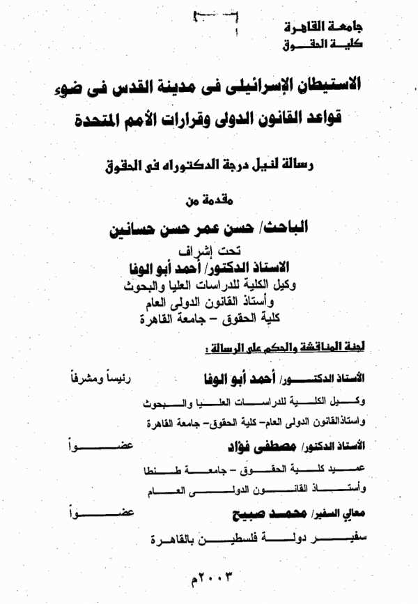 Dissertation note: اطروحة (ماجستير) - جامعة القاهرة - كلية الحقوق - قسم القانون الدولى، 2003