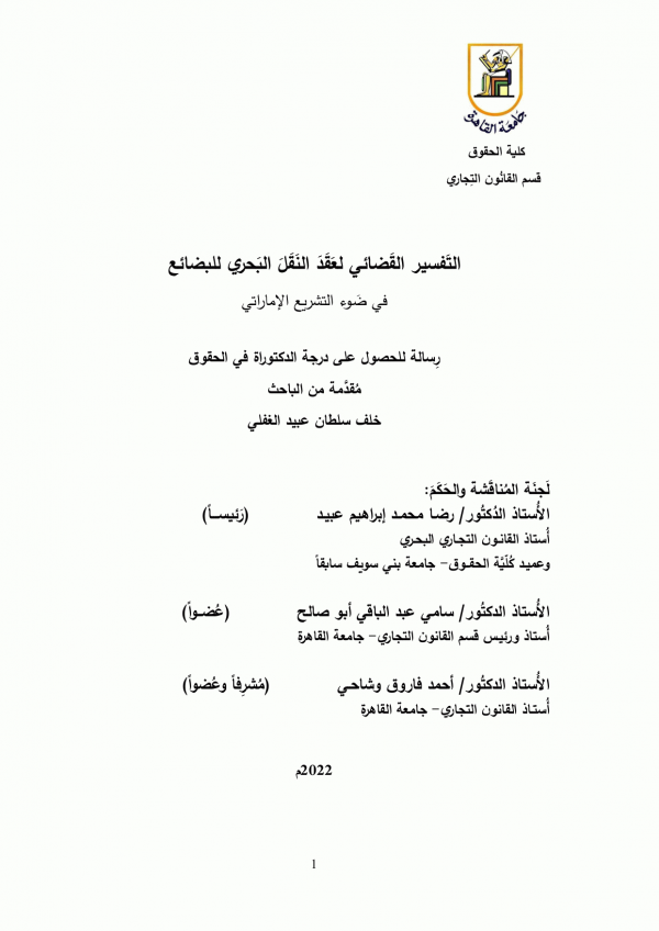 التفسير القضائي لعقد النقل البحري للبضائع في ضوء التشريع الإماراتي / إعداد خلف سلطان عبيد الغفلي ؛ إشراف رضـا محمـد إبراهيم عبيـد . by