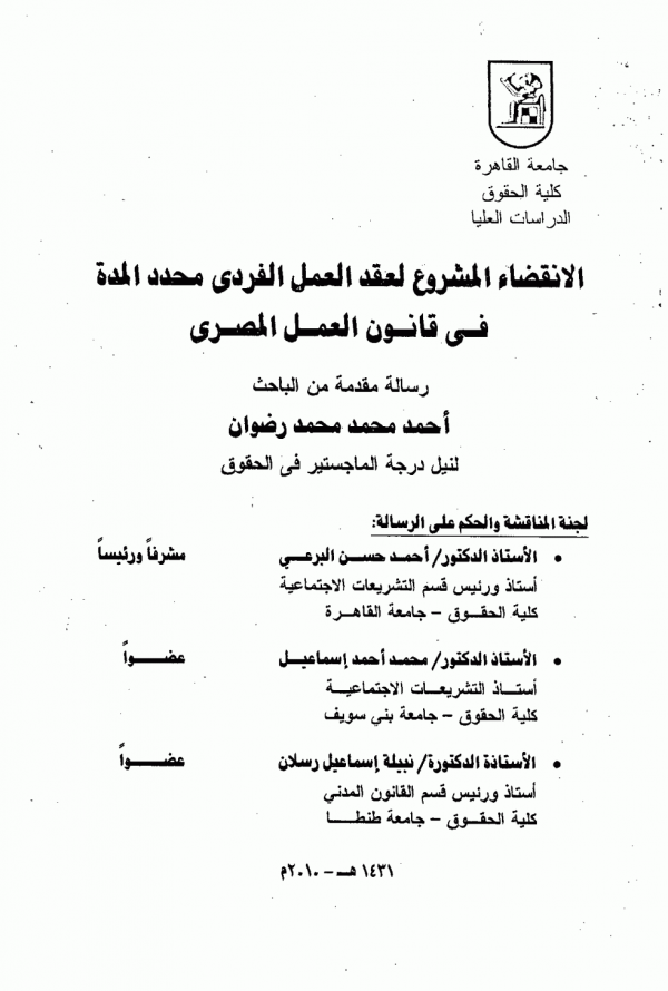 اطروحة (ماجستير) - جامعة القاهرة - كلية الحقوق - قسم التشريعات الاجتماعية، 2010