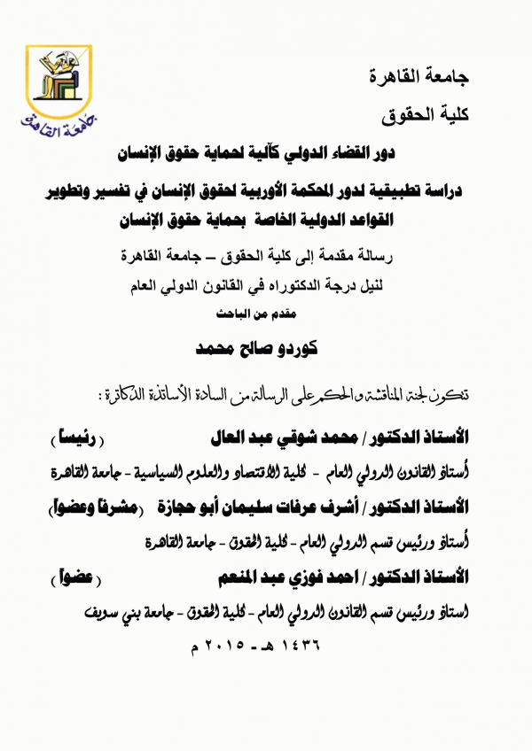 دور القضاء الدولى كآلية لحماية حقوق الإنسان : دراسة تطبيقية لدور المحكمة الأوربية لحقوق الإنسان فى تفسير و تطوير القواعد الدولية الخاصة بحماية حقوق الإنسان / كوردو صالح محمد by