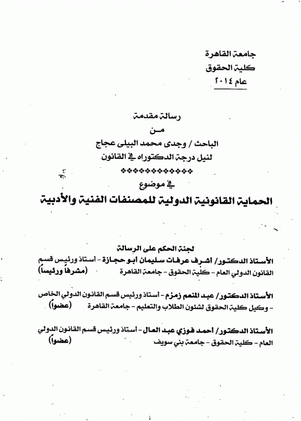 الحماية القانونية الدولية للمصنفات الأدبية والفنية / إعداد وجدي محمد البيلي عجاج ؛ إشراف أشرف عرفات سليمان أبو حجازة by