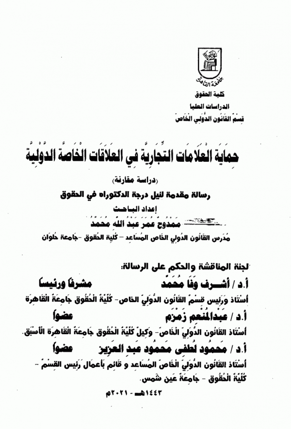 حماية العلامات التجارية فى العلاقَات الخَاصة الدولِية : دِرَاسَة مقارَنَة / ممدوح عمر عبدالله محمد by