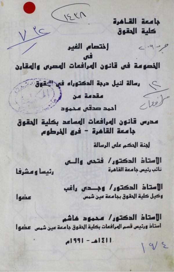 Dissertation note: أطروحة (دكتوراه)-جامعة القاهرة، كلية الحقوق، قسم قانون المرافعات 1991.