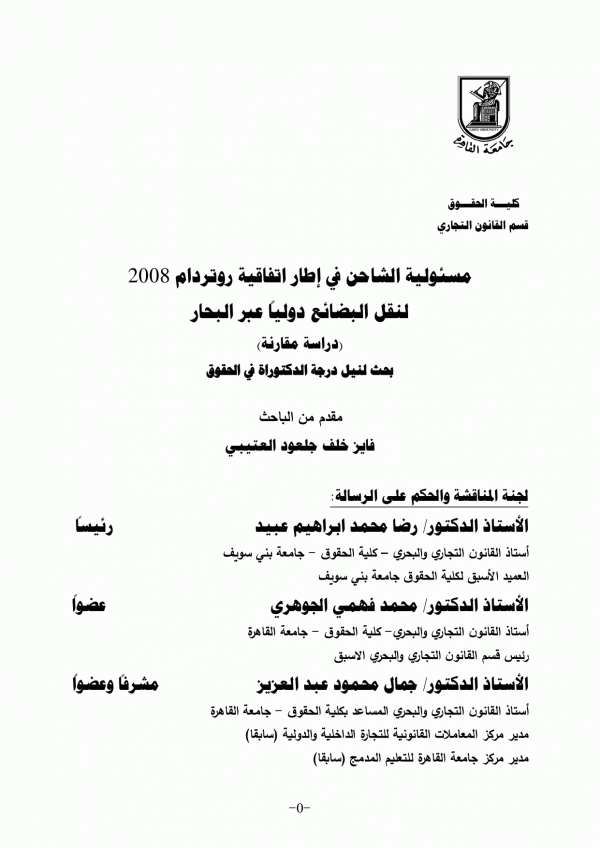مسئولية الشاحن فى إطار اتفاقية روتردام 2008 لنقل البضائع دوليا عبر البحار : دراسة مقارنة / إعداد فايز خلف جلعود العتيبي ؛ إشراف جمال محمود عبد العزيز. by