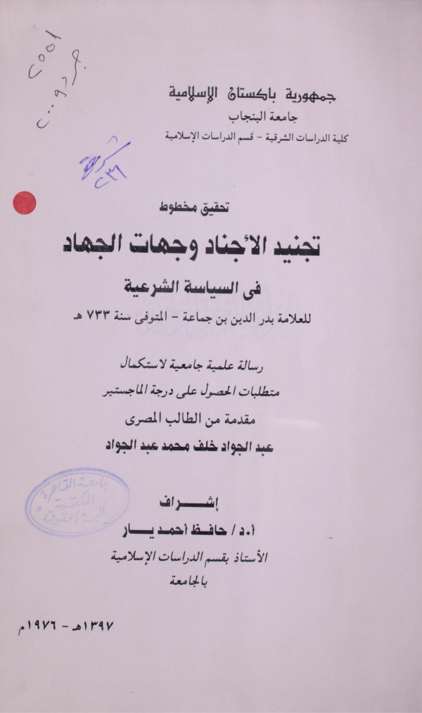 تحقيق مخطوط تجنيد الاجناد وجهات الجهاد فى السياسة الشرعية للعلامة بدر الدين بن جماعة -المتوفى سنة 733ه / إعداد عبدالجواد خلف محمد عبدالجواد ؛ إشراف حافظ احمد يار by