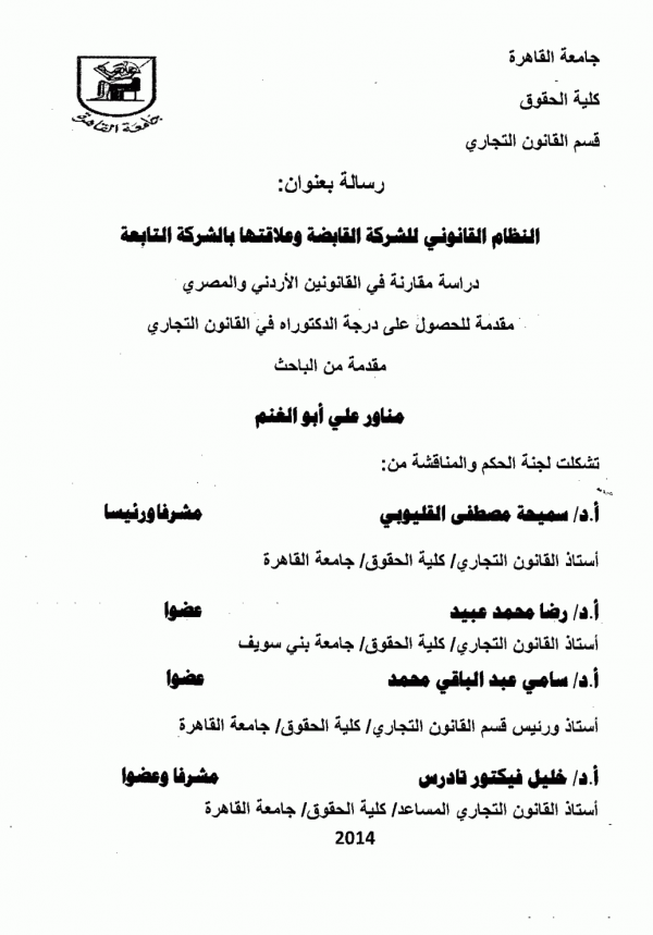 Dissertation note: اطروحة (ماجستير) - جامعة القاهرة - كلية الحقوق - قسم القانون التجارى، 2010
