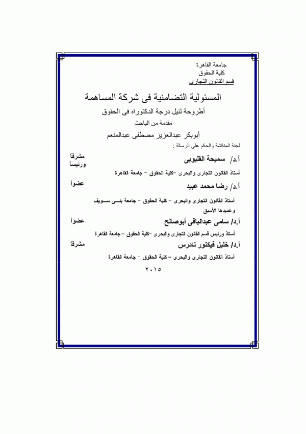 Dissertation note: اطروحة (دكتوراه) - جامعة القاهرة - كلية الحقوق، 2015، قسم القانون التجاري