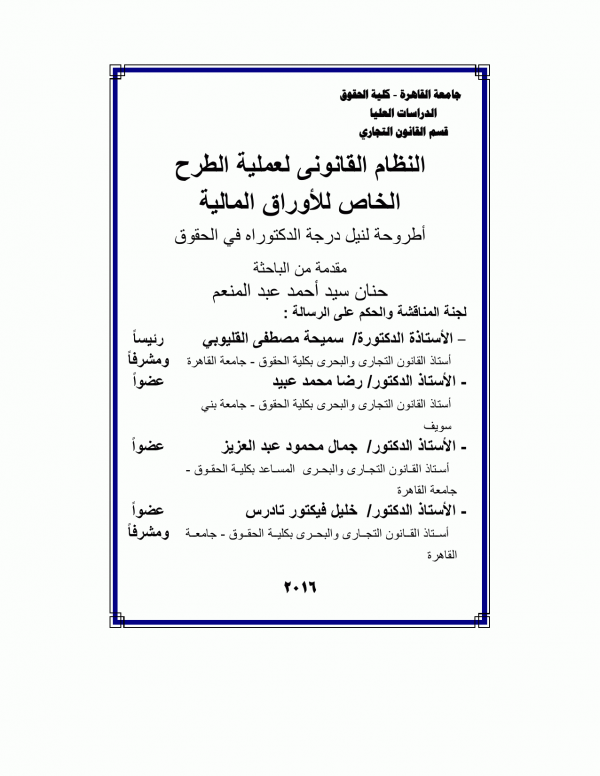 Dissertation note: أطروحة (دكتوراه) - جامعة القاهرة، كلية الحقوق، قسم القانون التجاري 2016.