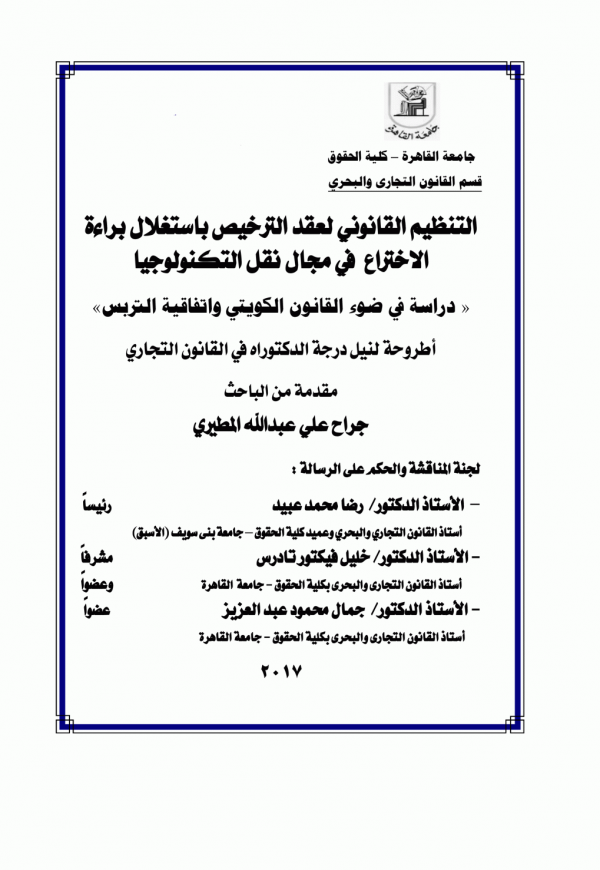 Dissertation note: اطروحة (دكتوراه) - جامعة القاهرة - كلية الحقوق، 2018، قسم القانون التجاري