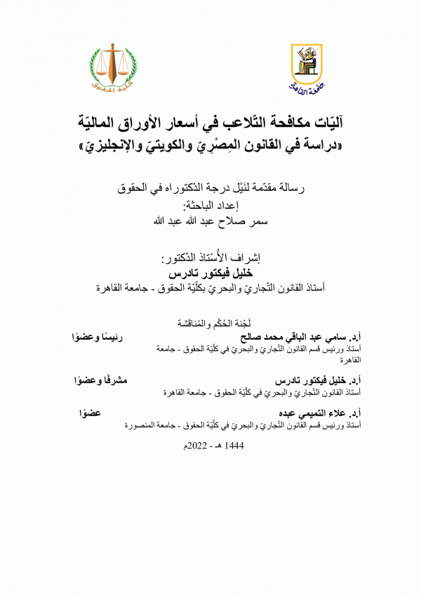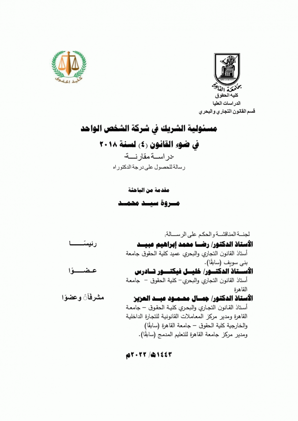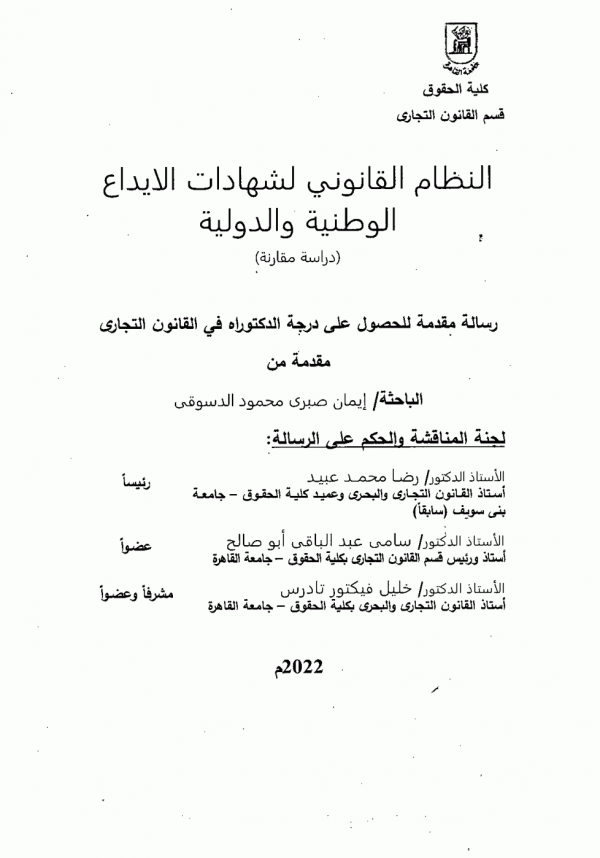 Dissertation note: أطروحة (دكتواره)-جامعة القاهرة- كلية الحقوق- قسم القانون التجاري، 2022