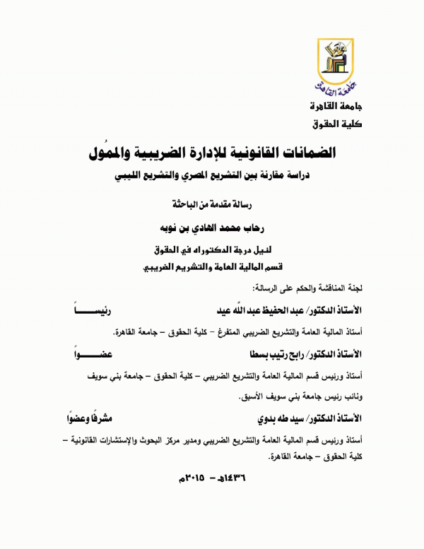 Dissertation note: اطروحة (دكتوراه) - جامعة القاهرة - كلية الحقوق - قسم المالية العامة والتشريع الضريبي، 2019