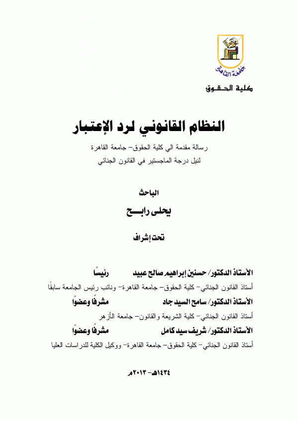 Dissertation note: أطروحة (ماجستير) - جامعة القاهرة، كلية الحقوق، قسم القانون الجنائي 2013.