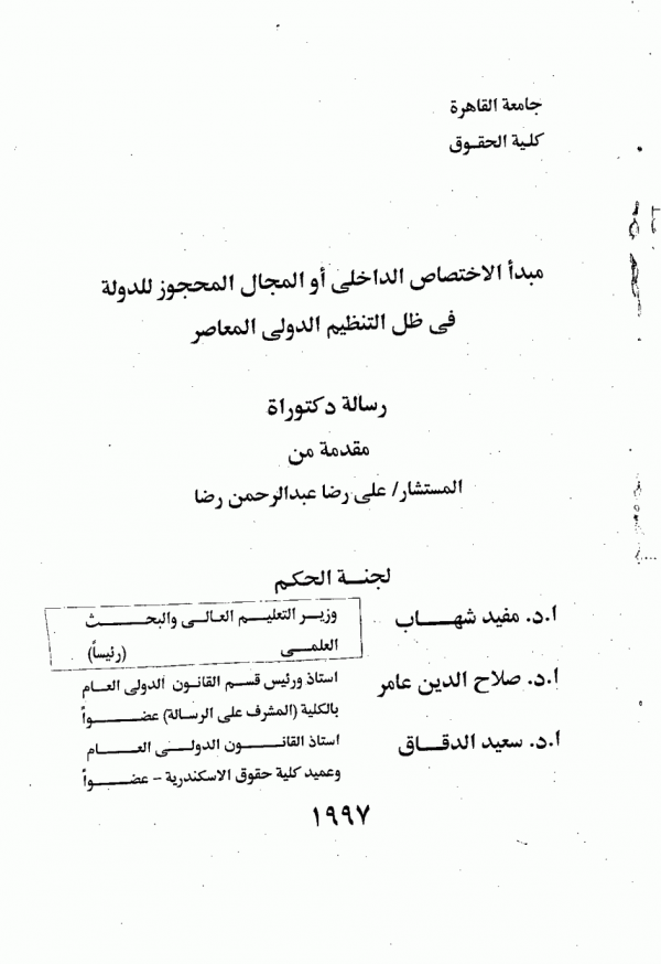 Dissertation note: اطروحة(ماجستير) - جامعة القاهرة - كلية الحقوق - قسم القانون الدولى، 1996