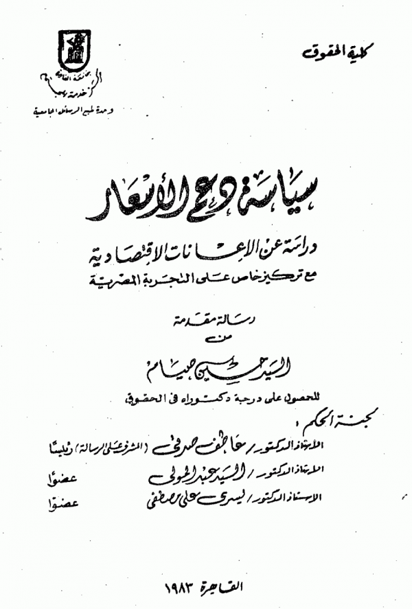 سياسة دعم الأسعار : دراسة عن الإعلانات الإقتصادية مع تركيز خاص على التجربة المصرية / إعداد السيد حسين صيام ؛ إشراف الأستاذ الدكتور عاطف صدقي. by