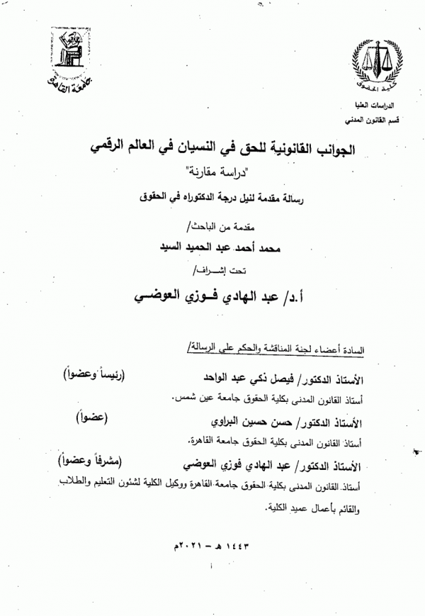 Dissertation note: أطروحة (دكتواره)-جامعة القاهرة، 2022، قسم القانون المدني