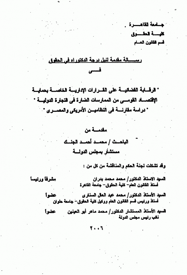 الرقابة القضائية على القرارات الإدارية الخاصة بحماية الاقتصاد القومي من الممارسات الضارة في التجارة الدولية : دراسة مقارنة في النظامين الأمريكي والمصري / إعداد محمد أحمد الجنك ؛ إشراف السيد الأستاذ الدكتور محمد محمد بدران. by