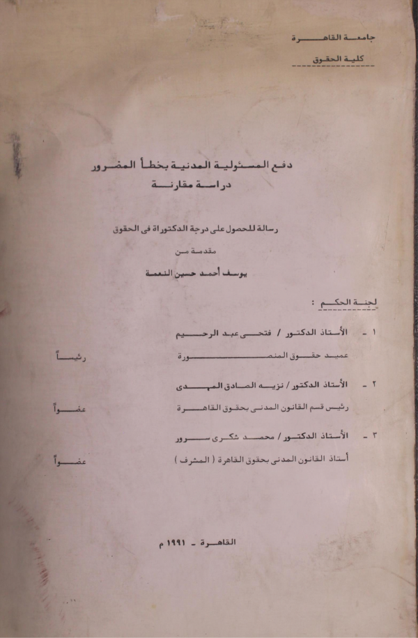 دفع المسئولية المدنية بخطأ المضرور : دراسة مقارنة / اعداد: يوسف احمد حسين النعمة ؛ اشراف: فتحي عبدالرحيم by