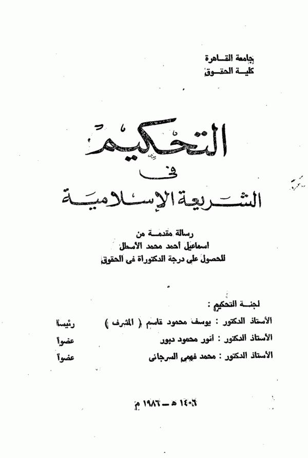 Dissertation note: أطروحة (ماجستير)-جامعة القاهرة-كلية الحقوق-قسم الشريعة الإسلامية، 1986