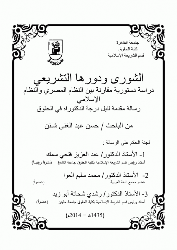 Dissertation note: اطروحة (دكتوراه) - جامعة القاهرة - كلية الحقوق - قسم الشريعة الإسلامية، 1986