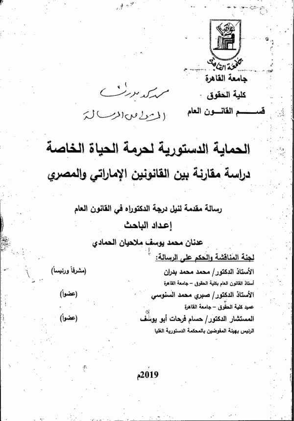 Other title: - Constitutional protection of the sanctity of private life : Comparative study between UAE and Egyptian laws