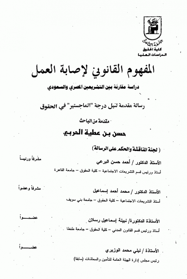المفهوم القانونى لاصابة العمل دراسة مقارنة بين التشريعين المصرى والسعودى / حسن بن عطية الحربى by