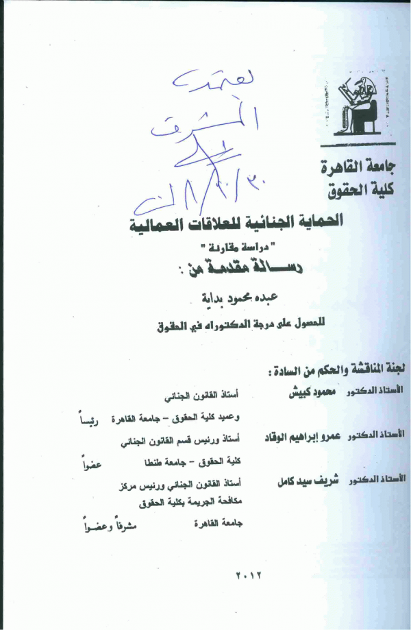 Dissertation note: اطروحة (دكتوراه) - جامعة القاهرة - كلية الحقوق - قسم التشريعات الاجتماعية، 2013