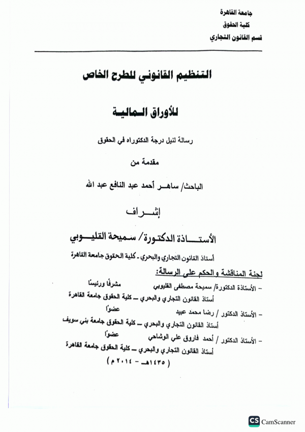 Dissertation note: أطروحة (ماجستير)-جامعة القاهرة، 2014، قسم القانون التجاري