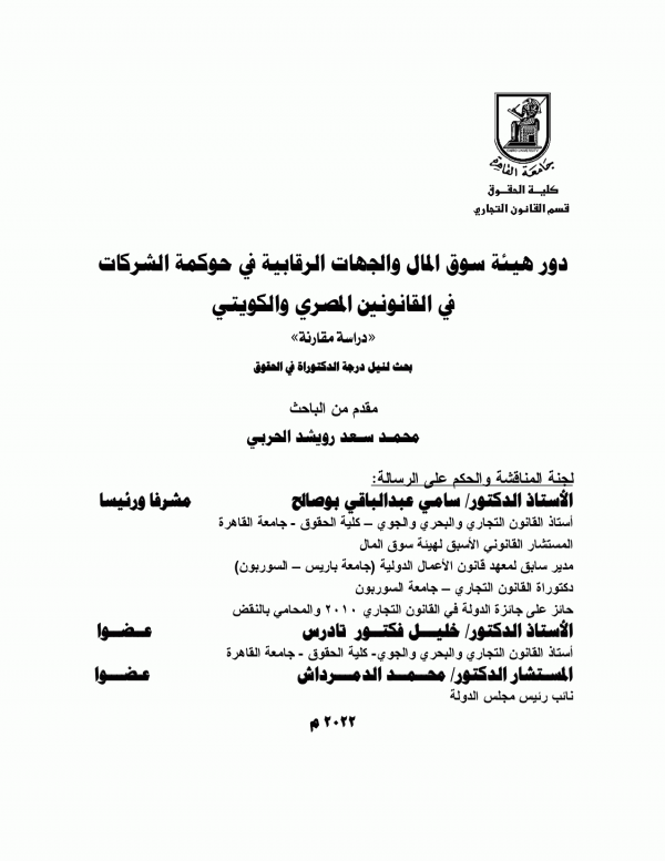 دور هيئة سوق المال والجهات الرقابية في حوكمة الشركاتفي القانونين المصري والكويتي : دراسة مقارنة / محمـد سـعد رويشد الحربي by