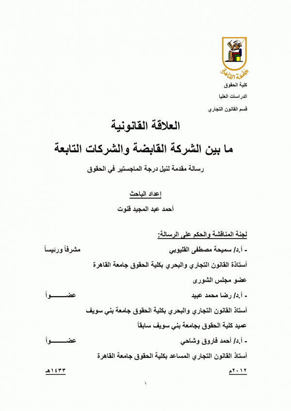 Dissertation note: اطروحة (دكتوراه) - جامعة القاهرة - كلية الحقوق - قسم القانون المدني، 2012