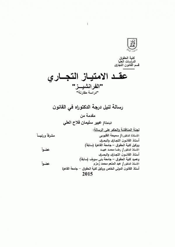 عقــد الامتيـاز التجــاري "الفرانشيـــز : دراسة مقارنة / إعداد عبير سليمان فلاح العلي ؛ إشراف سميحة القليوبى by