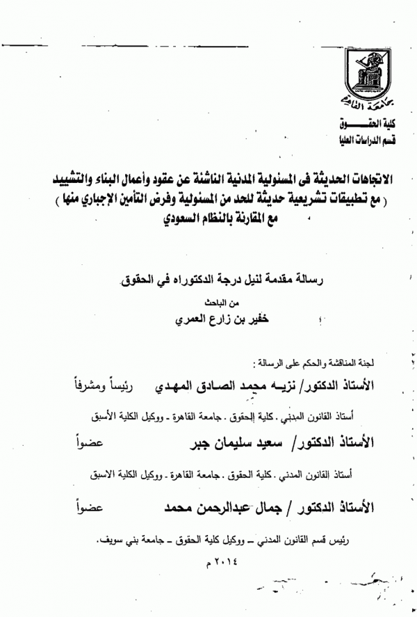 Dissertation note: أطروحة (دكتوراه) - جامعة القاهرة، كلية الحقوق، قسم القانون المدني 2023.