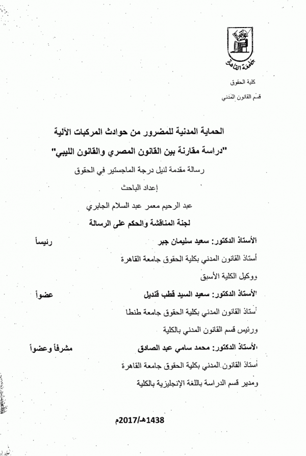 الحماية المدنية للمضرور من حوادث المركبات الآلية : دراسة مقارنة بين القانون المصري والقانون الليبي / عبدالرحيم معمر عبدالسلام الجابري by