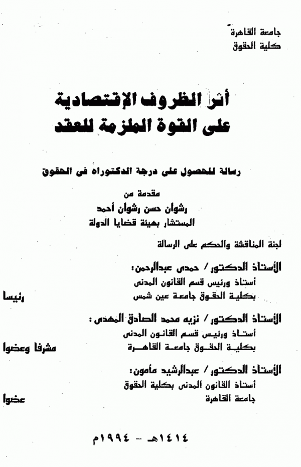 Dissertation note: اطروحة(دكتوراه) - جامعة القاهرة - كلية الحقوق - قسم القانون المدنى، 1994