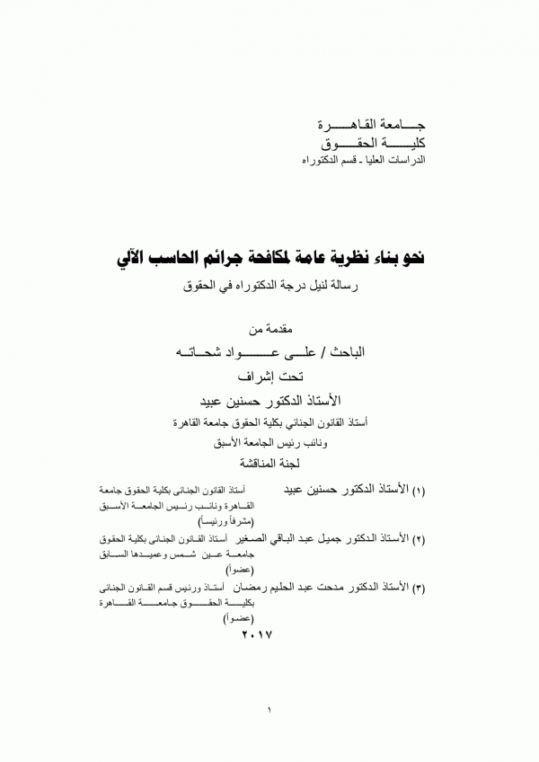 Dissertation note: اطروحة (دكتوراه) - جامعة القاهرة - كلية الحقوق - قسم القانون الجنائى، 2013
