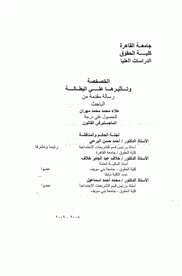 Dissertation note: اطروحة (ماجستير) - جامعة القاهرة - كلية الحقوق - قسم التشريعات الاجتماعية، 2009