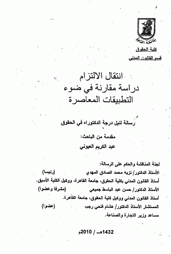 Dissertation note: اطروحة (دكتوراه) - جامعة القاهرة - كلية الحقوق - قسم القانون المدنى، 2010