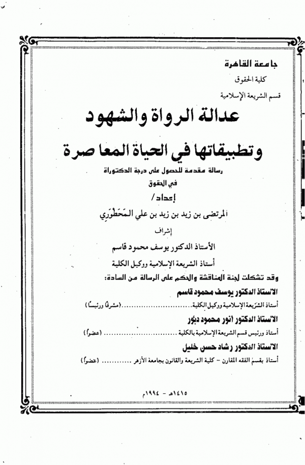 Dissertation note: اطروحة (دكتوراه) - جامعة القاهرة - كلية الحقوق - قسم الشريعة الاسلامية، 1989
