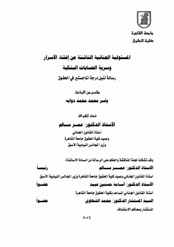 Dissertation note: اطروحة (ماجستير) - جامعة القاهرة - كلية الحقوق - قسم القانون الجنائي، 2016