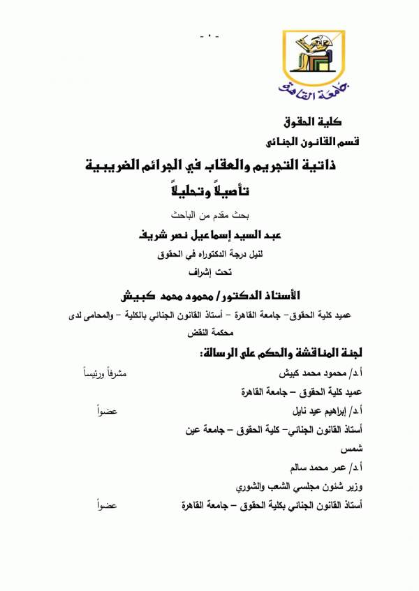 ذاتية التجريم والعقاب في الجرائم الضريبية : تأصيلا و تحليلا / إعداد عبدالسيد إسماعيل نصر شريف ؛ إشراف محمود محمد كبيش by