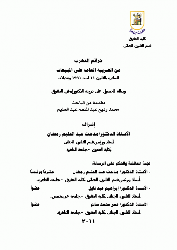 Dissertation note: أطروحة (دكتوراه)-جامعة القاهرة، 2011، قسم المالية العامة والتشريع الضريبي