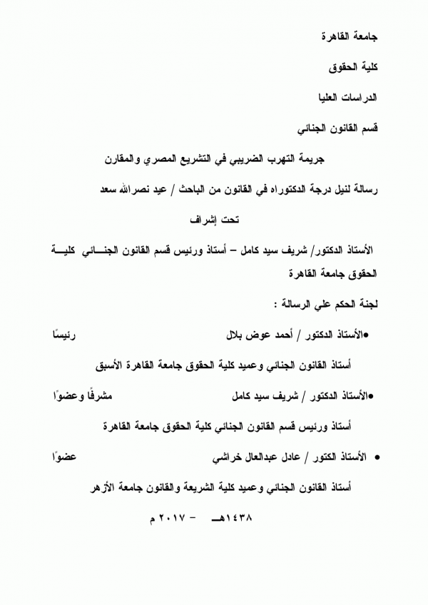 Dissertation note: أطروحة (دكتوراه)-جامعة القاهرة، كلية الحقوق، قسم القانون الجنائي 2017.