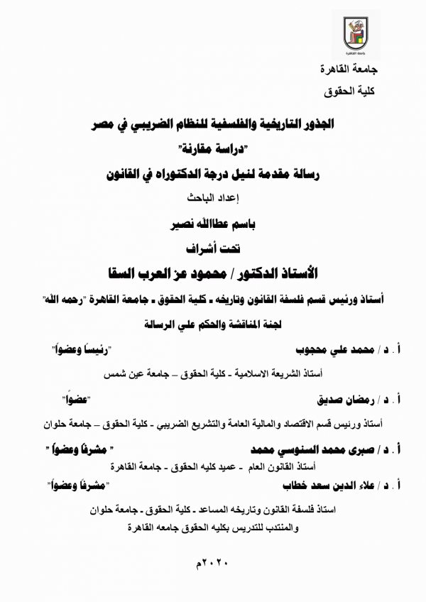 Dissertation note: أطروحة (دكتواره)-جامعة القاهرة-كلية الحقوق-قسم المالية العامة والتشريع الضريبي،2022