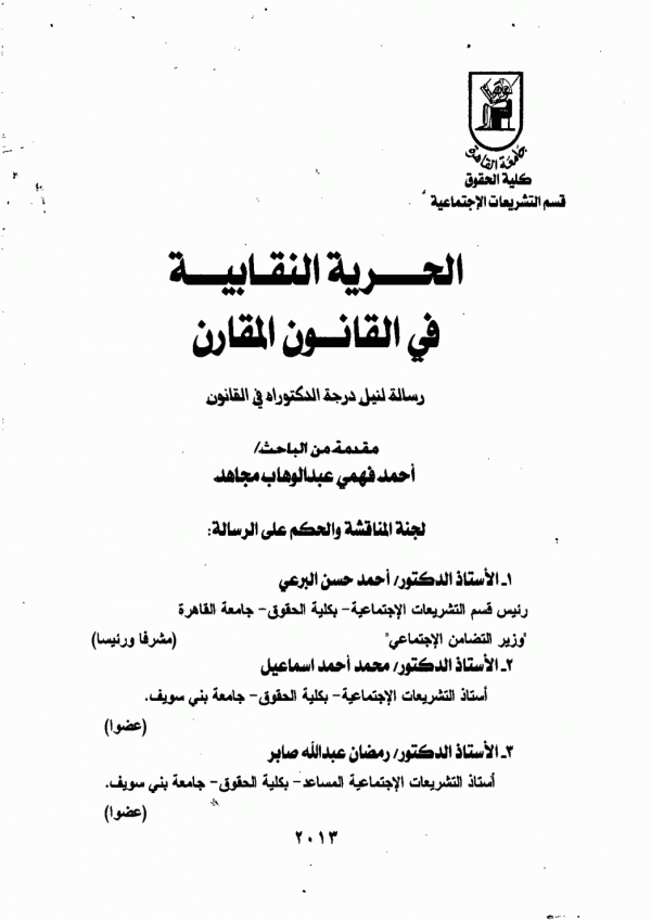 Dissertation note: اطروحة (دكتوراه) - جامعة القاهرة - كلية الحقوق - قسم التشريعات الاجتماعية، 2013