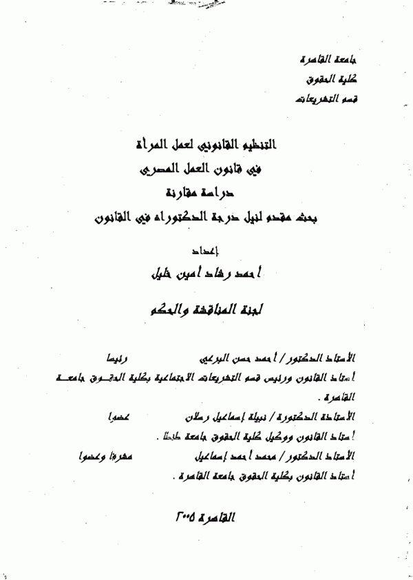 Dissertation note: اطروحة (دكتوراه) - جامعة القاهرة - كلية الحقوق - قسم التشريعات الاجتماعية، 2005