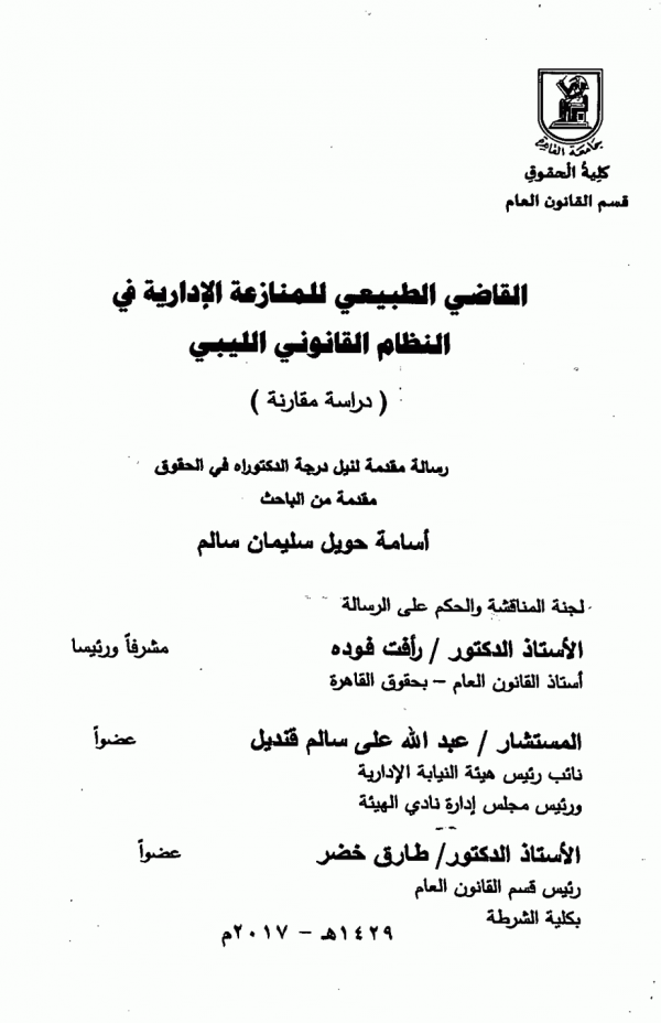 القاضي الطبيعي للمنازعة الإدارية في النظام القانوني الليبي : دراسة مقارنة / إعداد أسامة حويل سليمان سالم ؛ إشراف رأفت فوده by