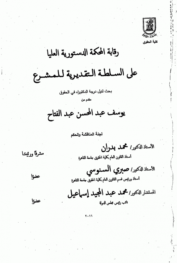 Dissertation note: اطروحة (دكتوراه) - جامعة القاهرة - كلية الحقوق - قسم القانون العام، 2016